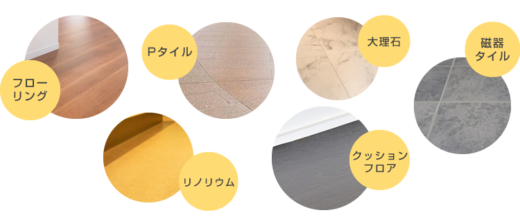 フローリング床・リノリウム床・Pタイル・クッションフロア・大理石・磁器タイル・壁面など